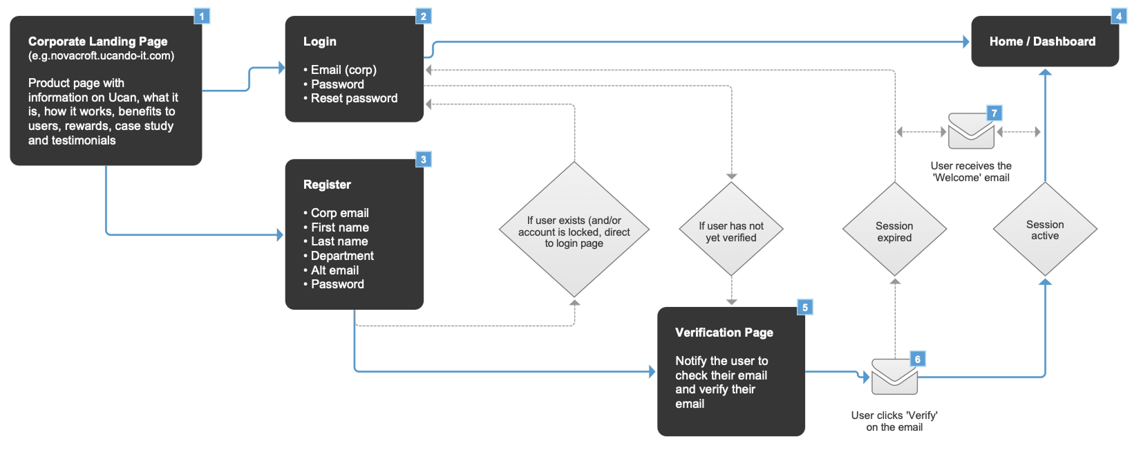 Registration flow: Corporate signup and verification.
