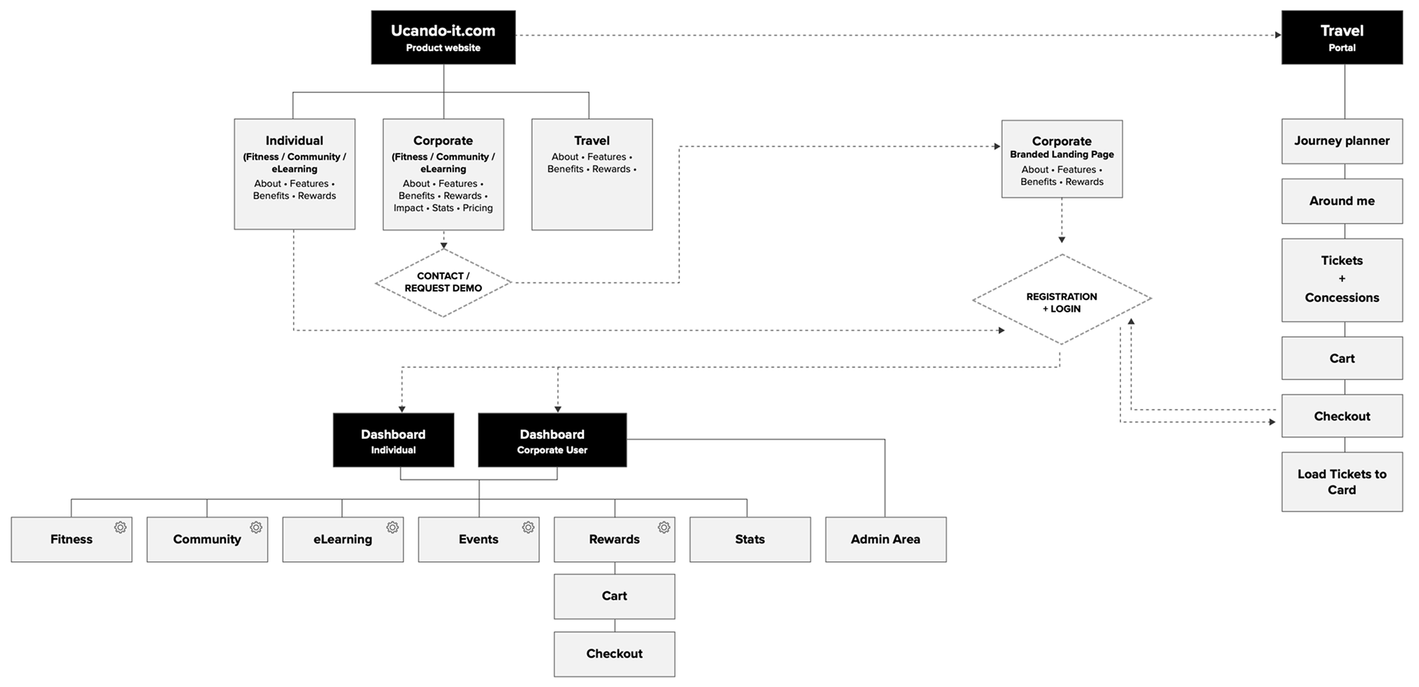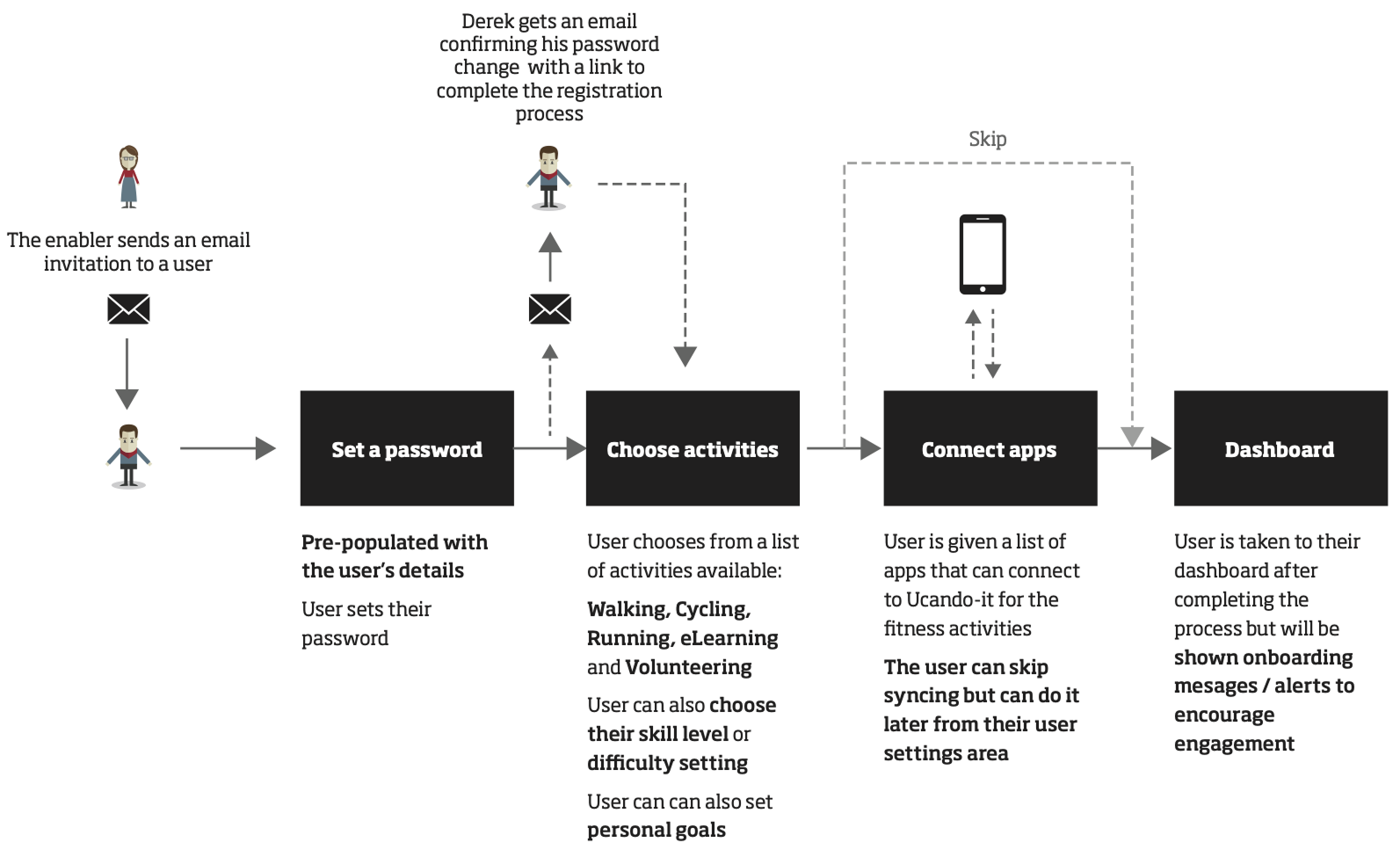 Examples of key user journeys used to explore onboarding, activity tracking and rewards.
