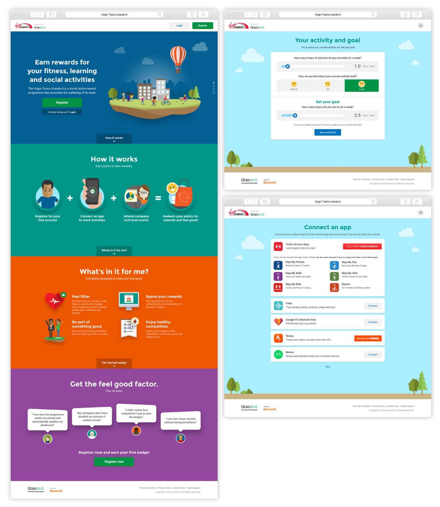 Landing page introducing the programme alongside key onboarding screens for setting activity goals and connecting third-party tracking apps.